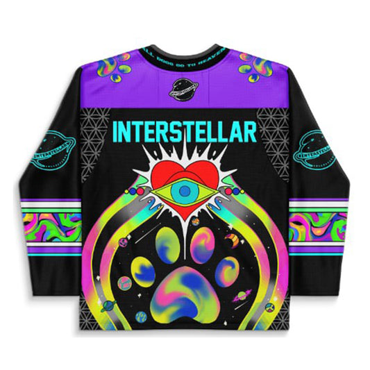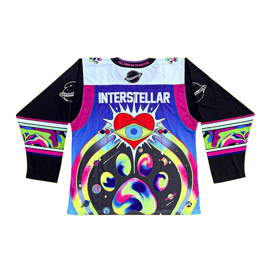 The Interstellar Jersey Collection is a limited-edition lineup of psychedelic rave jerseys designed for movement, self-expression, and connection. Each piece features bold, high-contrast visuals paired with meaningful themes, turning every jersey into a wearable story. From tributes to beloved dogs to cosmic dreamscapes, these designs are made to stand out and resonate on a deeper level.